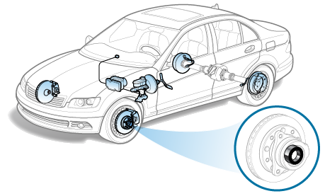 Os rolamentos de roda estão localizados no eixo traseiro (no interior do cubo de roda ou no encaixe do semi-eixo) ou no eixo dianteiro (no interior do cubo de roda ou no encaixe da manga de eixo).
